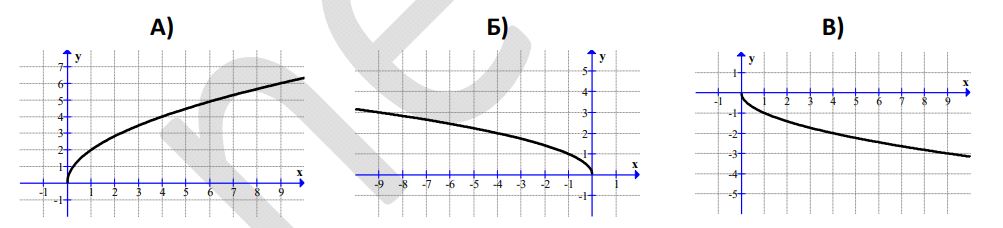 Установите соответствие между графиками функций и функциями, соответствующими этим графикам. В ответе укажите последовательность цифр, соответствующих А, Б, В, без пробелов и других разделительных символов.
