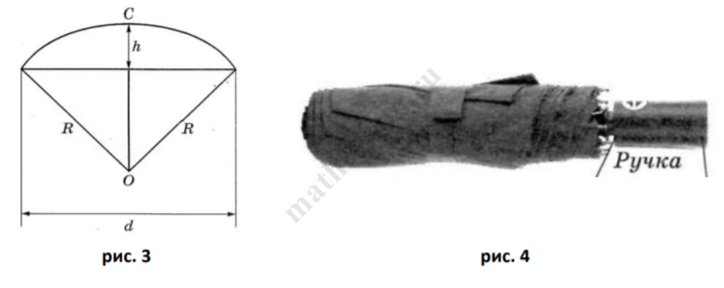 3. Боря предположил, что купол зонта имеет форму сферического сегмента. Вычислите радиус $$R$$ сферы купола (в см), зная, что $$OC=R$$(см. выше рис. 3).