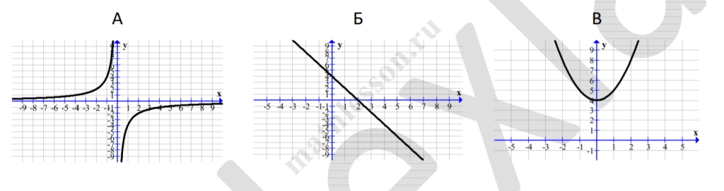 На рисунке изображены графики трёх функций. Установите соответствие между графиками и формулами, которые их задают. В ответе укажите последовательность цифр, соответствующих А, Б, В, без пробелов, запятых и других разделительных символов.