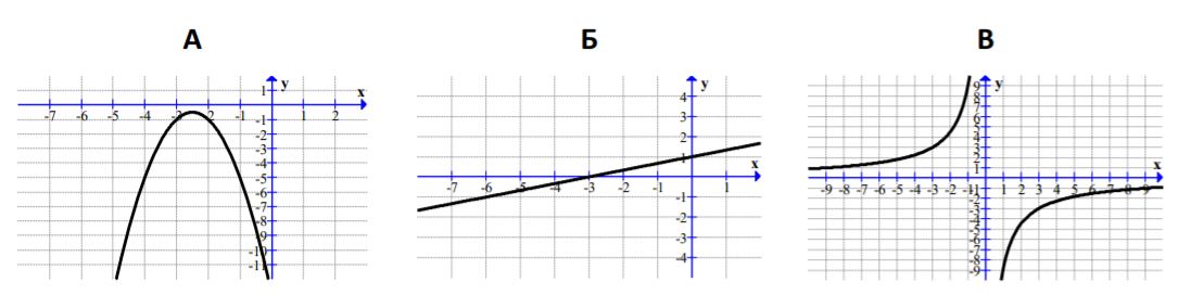 Ниже представлены графики функций $$y = f(x)$$. Установите соответствие между графиками функций и формулами, которые их задают. В ответе укажите последовательность цифр, соответствующих А, Б, В, без пробелов, запятых и других разделительных символов.