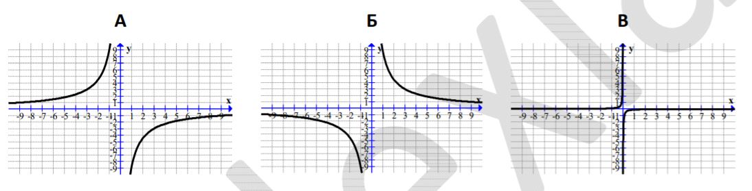 Ниже представлены графики функций $$y = f(x)$$. Установите соответствие между графиками функций и формулами, которые их задают. В ответе укажите последовательность цифр, соответствующих А, Б, В, без пробелов, запятых и других разделительных символов.