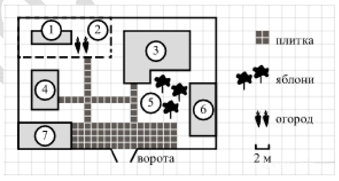 На плане изображено домохозяйство (сторона каждой клетки на плане соответствует 2 м). Участок имеет прямоугольную форму. Выезд и въезд осуществляются через единственные ворота.