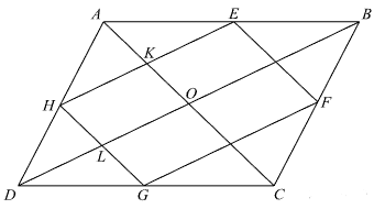 Введём обозначения, как показано на рисунке. Поскольку HG||AC и HE||BD, получаем, что HKOL — параллелограмм, следовательно, углы KHL и KOL равны. Рассмотрим треугольники ABC и EBF, угол EBF — общий, углы BEF и BAC равны как соответственные при параллельных прямых, углы BFE и BCA — аналогично, следовательно, треугольники ABC и BEF подобны по двум углам. Откуда $$\frac{EF}{AC}=\frac{BE}{AB}.$$ Аналогично подобны треугольники ABD и AEH, откуда $$\frac{HE}{BD}=\frac{AE}{AB}.$$ Пусть сторона ромба равна a, а длина короткой диагонали равна d. Сложим два полученных уравнения: