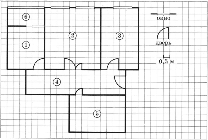 На рисунке изображён план двухкомнатной квартиры в многоэтажном жилом доме. Сторона каждой клетки на плане равна 0,5 м. Вход в квартиру находится в прихожей. Слева от входа расположен санузел, а справа - гостиная, кухня и спальня. На кухне есть выход в застеклённую лоджию. Их всех помещений в квартире гостиная занимает наибольшую площадь. 1. Для объектов, указанных в таблице, определите, какими цифрами они указаны на плане. Заполните таблицу. В ответе запишите последовательность пяти цифр без пробелов, запятых и других разделительных символов.| Объекты | спальня | санузел | кухня | гостиная | прихожая |