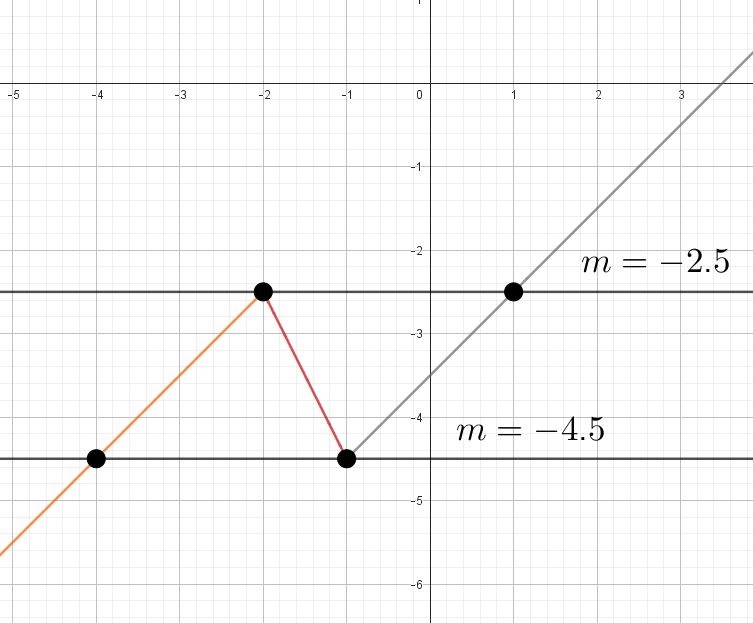 Постройте график функции $$y = \left\{\begin{aligned} x - 0{,}5, & x < -2; \\ -2x - 6{,}5, & -2 \leq x \leq -1; \\ x - 3{,}5, & x > -1 \end{aligned}\right.$$ Определите, при каких значениях $$a$$ прямая $$y = a$$ имеет с графиком этой функции ровно две общие точки.