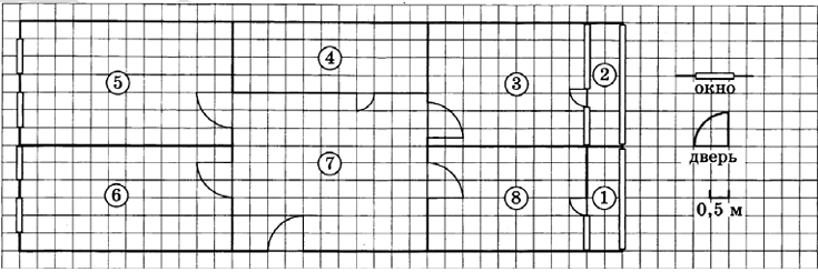 На рисунке (см. выше) изображён план трёхкомнатной квартиры в многоэтажном доме. Сторона каждой клетки на плане равна 0,5 м. Вход в квартиру находится в прихожей. Напротив входа располагается санузел. Справа от входа - гостиная и спальня, а слева - кухня и детская. В квартире есть две застеклённые лоджии. Площадь кухни равна 18 м2. Вход в детскую расположен напротив входа в гостиную. 1. Для объектов, указанных в таблице, определите, какими цифрами они обозначены на плане. Заполните таблицу. В ответе запишите последовательность пяти цифр без пробелов, запятых и других разделительных символов.