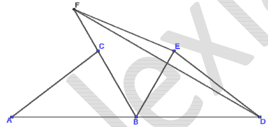 Даны три равных друг другу треугольника $$ABC$$, $$DBE$$ и $$FBE$$. Точки $$A$$, $$B$$ и $$D$$ лежат на одной прямой. Точки $$B$$, $$C$$ и $$F$$ тоже лежат на одной прямой (см. рисунок). Найдите градусную меру угла $$FDB$$.