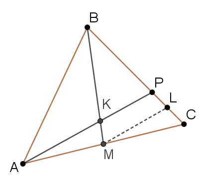 2) Пусть $$ML||KP$$. По теореме Фалеса: $$\frac{AM}{MC}=\frac{PL}{LC}=\frac{1}{1}$$; $$\frac{BK}{KM}=\frac{BP}{PL}=\frac{4}{1}$$.