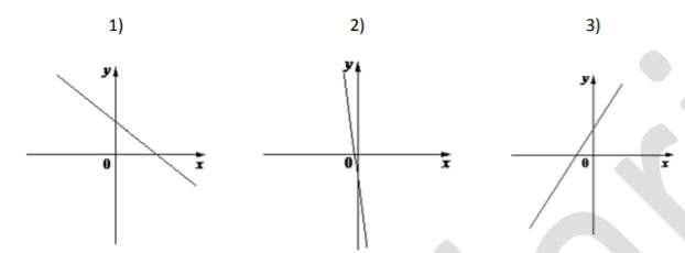 Ниже представлены графики функций вида $$y = f(x) = kx + b$$ и значения коэффициентов $$k$$ и $$b$$. Установите соответствие между графиками функций и значениями коэффициентов $$k$$ и $$b$$. В ответе укажите последовательность цифр, соответствующих А, Б, В, без пробелов, запятых и других разделительных символов.