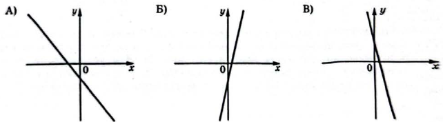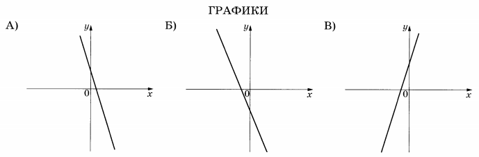 На рисунках изображены графики функций вида $$y = kx + b$$. Установите соответствие между графиками функций и знаками коэффициентов $$k$$ и $$b$$.