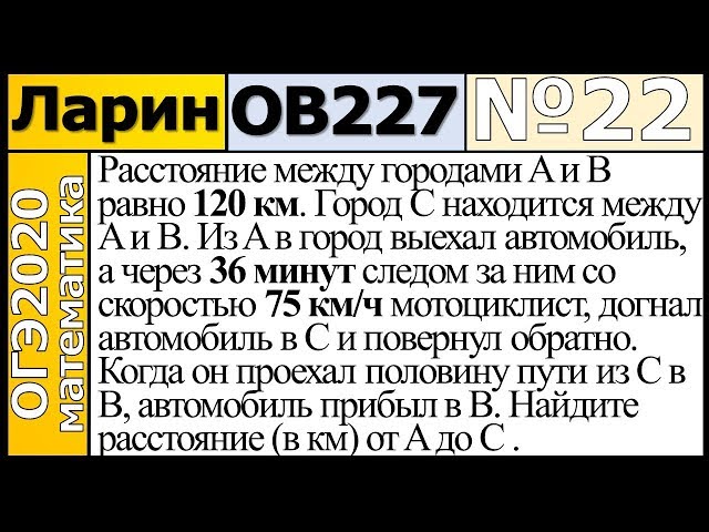 Расстояние между городами $$A$$ и $$B$$ равно $$120$$ км. Из города $$A$$ в город $$B$$ выехал автомобиль, а через $$36$$ минут следом за ним со скоростью $$75$$ км/ч выехал мотоциклист, догнал автомобиль в городе $$C$$ и повернул обратно. Когда он вернулся в $$A$$, автомобиль прибыл в $$B$$. Найдите расстояние от $$A$$ до $$C$$. Ответ дайте в километрах.
