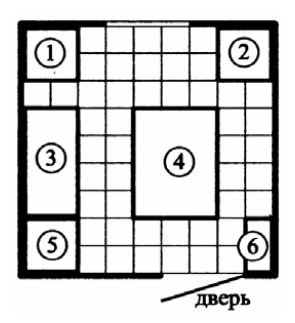 Владелец собирается провести ремонт своей квартиры. На плане (см. выше) изображена будущая расстановка мебели и бытовой техники на кухне после ремонта. Сторона каждой клетки на плане равна 0,4 м. Кухня имеет прямоугольную форму. Единственная дверь кухни деревянная, в стене напротив двери расположено окно. Справа от двери будут поставлены полки для посуды, слева от двери будет холодильник. Слева от холодильника, в углу кухни, предполагается смонтировать раковину. Между раковиной и газовой плитой будет собран буфет, отмеченный на плане цифрой 2. Площадь, занятая буфетом, по плану будет равна 0,96 м2. В центре кухни планируется поставить обеденный стол.