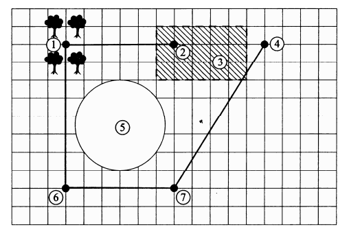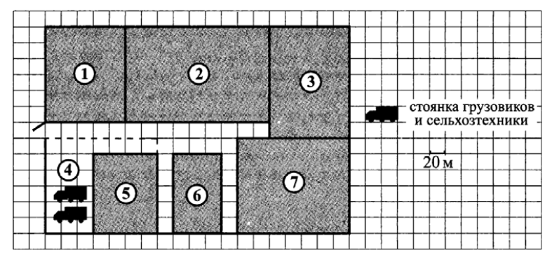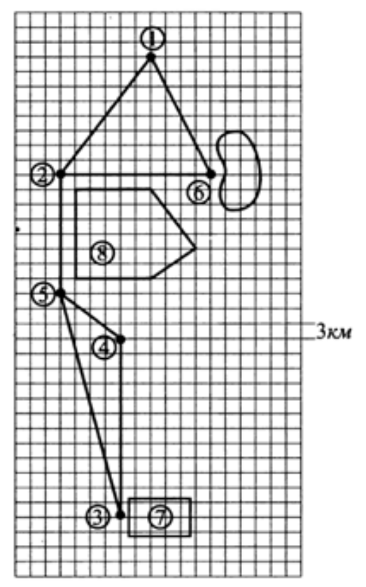 На плане (см. рисунок) изображена местность, прилегающая к озеру Круглому. Для удобства план нанесён на квадратную сетку, сторона каждого квадрата которой равна 500 м. Населённые пункты обозначены на плане жирными точками. Рядом с озером Круглое находится болото, обозначенное на плане штриховкой. На болоте расположен хутор Камышино. От хутора Камышино проложена дорога к деревне Дубки, вокруг которой имеются дубовые рощи. Далее дорога идёт к селу Большое, расположенному по другую сторону озера от хутора Камышино. Село Большое соединено также дорогой с деревней Малая, обозначенной на плане цифрой 7. Деревня Малая, в свою очередь, соединена дорогой с деревней Дальней (отмечена цифрой 4). Преобладающая часть изображённой на плане местности – это поля, используемые для выращивания злаков.
