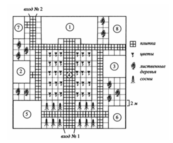 На плане (см. рисунок) представлен дизайн‐проект сквера в станице Лужки. Сторона большой клетки равна 2 метра. Участок, отведённый под сквер, имеет квадратную форму. По периметру участка планируется установить забор. С двух сторон сквера будут два входа. Если зайти в сквер, то справа от входа № 1 будет располагаться карусель, а слева – детский игровой комплекс, отмеченный на плане цифрой 5. Дом творчества будет находиться слева, если зайти через вход № 2, а зооуголок – справа. Центр сквера, отмеченный цифрой 4, планируется украсить фонтаном диаметром 2 метра и двумя цветочными клумбами. Рядом с детским игровым комплексом построят кафе, рядом с каруселью – кинотеатр площадью 64 м2. За кинотеатром будет оборудована тренажёрная площадка, отмеченная цифрой 8. На территории сквера шириной 2 м будут выложены тротуарной плиткой. Размером 1 м × 1 м. Аллея шириной 4 м располагается от входа № 1 до Дома творчества и выложена той же плиткой, что и дорожки.