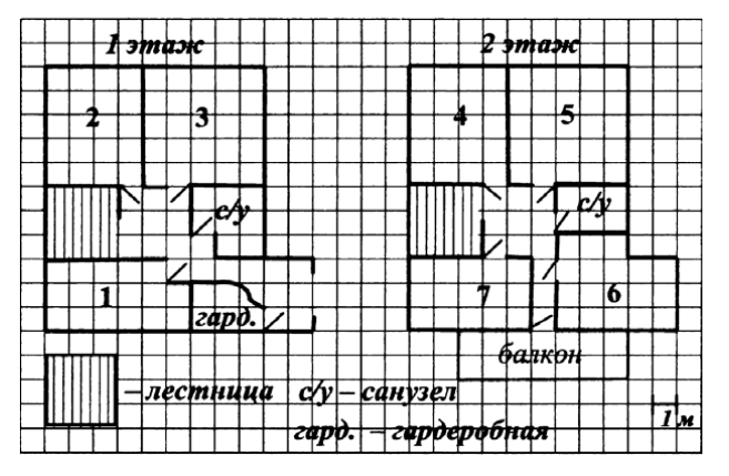 Сергей Васильевич – крупный учёный. На рисунке изображён план двухэтажного дома (сторона клетки соответствует 1 м), в котором он проживает с женой Валентиной Петровной и двумя детьми: Костей и Викой. На первом этаже гостиная – самая большая по площади комната. Кухня имеет вытянутую форму, её длина в два раза больше ширины, она тоже находится на первом этаже. Рядом с гостиной расположена столовая. Комната Кости расположена на втором этаже над кухней, его комната – соседняя с комнатой сестры Вики. Комната родителей расположена над столовой, рядом с ней просторный кабинет Сергея Васильевича.
