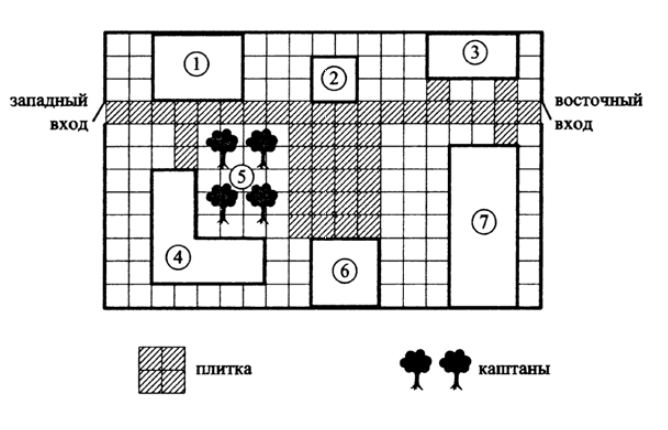 На плане (см. рисунок) изображён парк культуры и отдыха города Малый. Сторона каждой клетки равна 2 м. Парк имеет прямоугольную форму. Зайти в парк можно через один из двух входов: западный или восточный. Если зайти в парк через западный вход, то слева будет расположено кафе «Полдник», а справа – детская площадка. Рядом с детской площадкой посажены каштаны. Рядом с восточным входом располагаются общественные туалеты и бадминтоновая площадка, обозначенная на плане цифрой 7. Помимо указанных объектов, в парке имеются фонтан (отмечен цифрой 2) и сцена. Все дорожки в парке ширину 2 м и вымощены тротуарной плиткой 1 м × 1 м. Между фонтаном и сценой имеется площадка, вымощенная такой же плиткой.