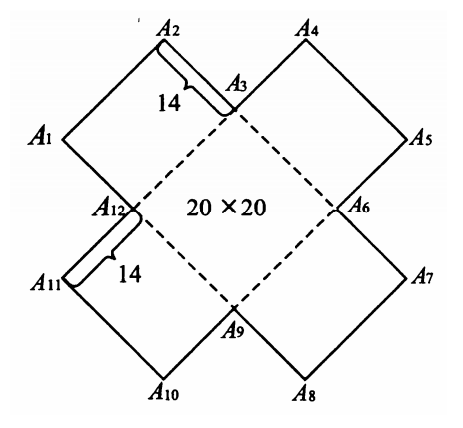 На плане (см. рисунок) изображена вертолётная взлётно‐посадочная площадка, которую требуется построить. Сначала будет строиться квадратная площадка размером 20 м × 20 м, а затем к ней будут пристраиваться 4 одинаковые прямоугольные площадки 20 м × 14 м так, как показано на плане. Точками A1 , A2 , …, A12 отмечается внешний периметр площадки.