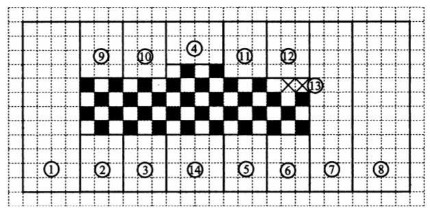 На плане (см. рисунок) с размером клетки 20 см × 20 см изображена схема размещения шкафов на одной из стен кухни. Номером 1 обозначен шкаф для посуды, а номером 14 – плита, над которой находится вытяжка. Слева от плиты находится мойка, над ней – сушилка, справа от плиты – посудомоечная машина, затем стиральная машина. В конце стенки расположен холодильник и морозильная камера, обозначенная цифрой 8. Другие шкафы, расположенные в верхнем ряду, служат для хранения сыпучих продуктов и специй. В нижнем модуле есть шкаф для средств бытовой химии, обозначенный цифрой 2. Между верхними и нижними шкафами расположен «фартук», который выложен плиткой разного цвета: коричневого, красного, жёлтого и белого, размером 20 см × 20 см. В правом верхнем углу «фартука» поверх двух плиток установлен блок розеток, на плане он обозначен номером 13.