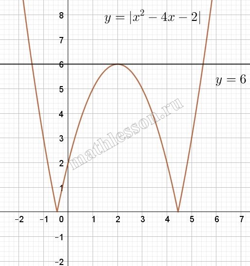 Постройте график функции $$y = |x^2 - 4x - 2|$$ и определите, при каких значениях $$c$$ прямая $$y = c$$ имеет с графиком три общие точки.