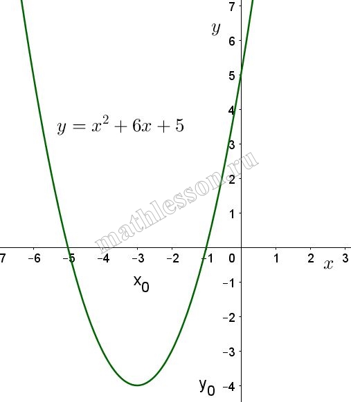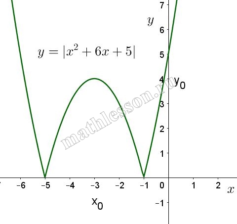Рассмотрим график функции $$y_{1}=x^{2}+6x+5$$. Искомый будет отличаться от данного тем, что та часть параболы, которая находится под осью Ох симметрично отобразиться относительно оси Ох (в силу того, что модуль все отрицательные значения сделает положительными). Найдем вершину параболы: $$x_{0}=-\frac{b}{2a}=-\frac{6}{2}=-3$$ , $$y_{1}(3)=(-3)^{2}+6*(-3)+5=-4$$. Найдем еще несколько значений для функции $$y_{1}$$: $$y_{1}(-2)=-3 ; y_{1}(-1)=0 ; y_{1}(0)=5$$.