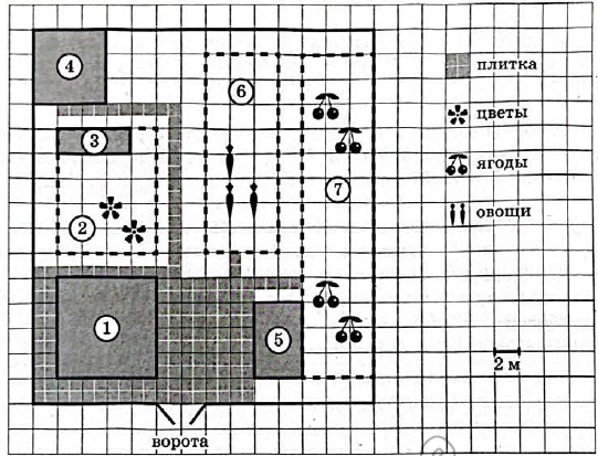 На схеме (см. выше) изображён план застройки участка. Участок имеет прямоугольную форму. Сторона каждой клетки на плане равна 2 м. Въезд и выезд осуществляется через единственные ворота, расположенные в восточной части участка. При въезде на участок слева от ворот находится фруктовый сад, а далее птичник. Рядом с птичником расположен вольер для выгула птиц площадью 48 м2 и квадратный водоём, обозначенный на плане цифрой 3. Справа от ворот находится огород, на территории которого построен сарай, обозначенный на плане цифрой 7. От ворот до дальнего края участка, где расположен жилой дом, идёт асфальтированный проезд. Напротив дома находятся гараж, отмеченный на плане цифрой 2, и летняя кухня. Площадка между домом и гаражом также покрыта асфальтом. К участку подведено электричество. Имеется магистральное водоснабжение.