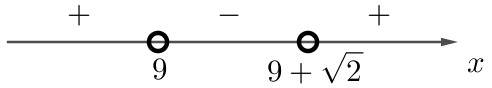 2) Нули: $$x_1 = 9,\qquad x_2 = 9 + \sqrt{2}.$$ Отметим их на координатной прямой. Расставим знаки, которые принимает выражение $$(x - 9)(x - 9 - \sqrt{2})$$ на полученных интервалах: