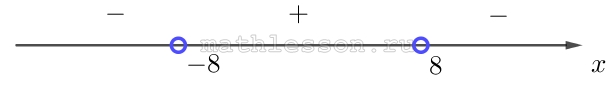 Разложим выражение слева на множители: $$(8-x)(8+x)<0$$. Отметим на координатной прямой точки (пустые, так как неравенство строгое), когда выражение слева равно 0 и расставим знаки значений, которые принимает выражение на полученных промежутках: