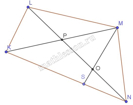 По т. Менелая из $$\Delta KMS$$ и секущей NP: $$\frac{NO}{OP}*\frac{PM}{MK}*\frac{MS}{SN}=1$$