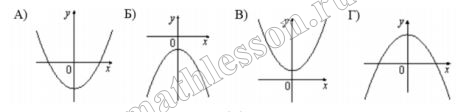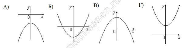 Ниже представлены графики функции вида $$y = ax^2 + c$$. Установите соответствие между графиками и знаками коэффициентов $$a$$ и $$c$$. В ответе укажите последовательность цифр, соответствующих А, Б, В, Г, без пробелов, запятых и других разделительных символов.