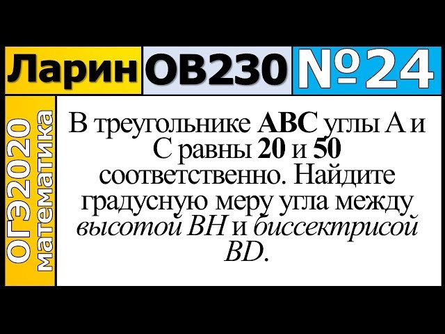 В треугольнике $$ABC$$ углы $$A$$ и $$C$$ равны $$20^{\circ}$$ и $$50^{\circ}$$ соответственно. Найдите градусную меру угла между высотой $$BH$$ и биссектрисой $$BD$$.