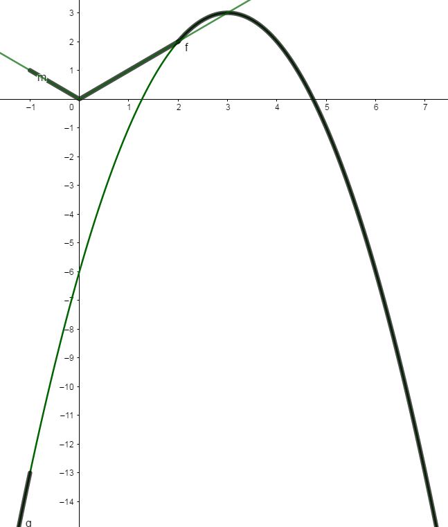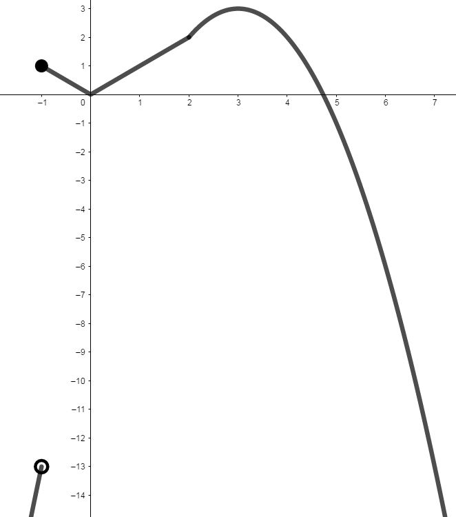 Постройте график функции $$y = \left\{\begin{aligned} |x|,\ -1 \le x \le 2 \\ -x^2 + 6x - 6,\ x > 2;\ x -1 \end{aligned}\right.$$ и определите, при каких значениях $$a$$ прямая $$y = a$$ имеет с графиком ровно две общие точки.
