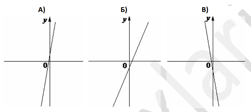 Установите соответствие между графиками функций вида $$y = kx + b$$ и знаками коэффициентов $$k$$ и $$b$$. В ответе запишите три цифры, соответствующие буквам А, Б, В, без пробелов и других дополнительных символов.