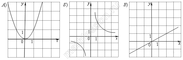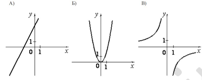 А: Представлена линейная функция, общий вид которой $$y=ax+b$$. Данному вида соответствует вариант под номером 2 Б: Представлена квадратичная функция, вид которой для данного графика выглядит как $$y=ax^{2}$$. Ему соответствует 3 вариант. В: Представлена обратная пропорциональность, вид которой для данного графика $$y=-\frac{k}{x}$$ (так как располагается во второй и третьей координатных четвертях). Ему соответствует 1 вариант ответа.