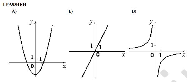 На рисунке изображены графики трёх функций. Установите соответствие между графиками и формулами, которые их задают. В ответе укажите последовательность цифр, соответствующих А, Б, В, без пробелов, запятых и других разделительных символов.
