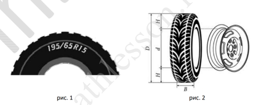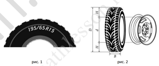 Для маркировки автомобильных шин применяется единая система обозначений. Например, $$195/65 R15$$ (рис. 1). Первое число означает ширину шины в миллиметрах (размер $$B$$ на рисунке 2). Второе число — высота боковины шины $$H$$ в процентах от ширины шины. Например, шина с маркировкой $$195/65 R15$$ имеет ширину $$B = 195$$ мм и высоту боковины $$H = 195 \cdot 0,65 = 126,75$$ мм.