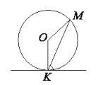 Прямая касается окружности в точке $$K$$. Точка $$O$$ – центр окружности. Хорда $$KM$$ образует с касательной угол, равный $$50^\circ$$. Найдите величину угла $$MOK$$. Ответ дайте в градусах.