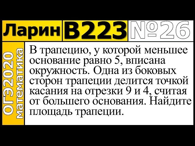 В трапецию, у которой меньшее основание равно $$5$$, вписана окружность. Одна из боковых сторон трапеции делится точкой касания на отрезки $$9$$ и $$4$$, считая от большего основания. Найдите площадь трапеции.