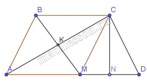 2) Пусть $$MK=x$$ $$\Rightarrow$$ $$CK=2x$$, $$CM=3x$$, $$CD=5y$$ $$\Rightarrow$$ $$DK=3y$$, $$\angle CMD=\delta$$