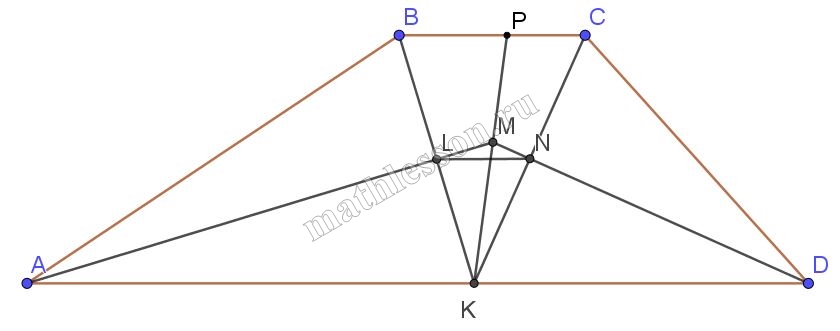 3) $$MK\cap LN=Q$$; $$KM\cap BC=P$$. Тогда : $$LN\left | \right |BC$$, $$BC\left | \right |AD\Rightarrow$$ $$LN\left | \right |AD$$ и : $$\Delta LMN\sim \Delta AMD\Rightarrow$$ $$QN:QL=KD:KA=5:9\Rightarrow$$ $$QL=\frac{9 QN}{5}(2)$$
