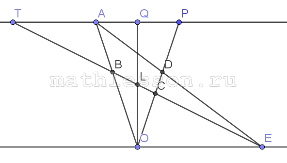 A) 1) Пусть C между O и D. Проведем через $$A n\left | \right |OM$$: $$P=CD\cap n$$; $$Q=OL\cap n$$; $$T=CB\cap n$$