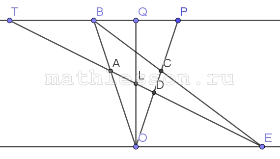 Б) 1) Пусть D располагается между O и C. Проведем через $$B n\left | \right |OM$$: $$OL\cap n=Q$$; $$OC\cap n=P$$; $$OA\cap n=T$$