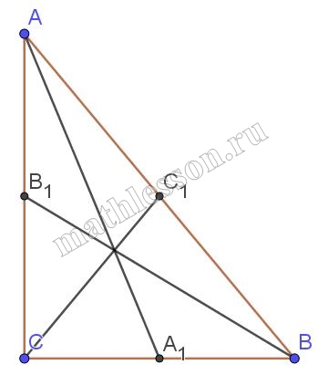 1) $$CC_{1}=\frac{1}{2}AB$$( свойство медиан из прямого угла) пусть $$AC^{2}=x^{2}$$, $$CB^{2}=y^{2}\Rightarrow$$ $$AB^{2}=x^{2}+y^{2}$$
