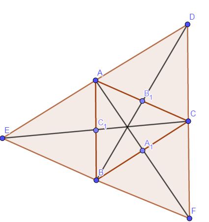 На каждой стороне треугольника достроим параллелограмм, как показано на рисунке и введем обозначения: BC=a;AB=c;AC=b;CC1=mc;BB1=mb;AA1=ma
