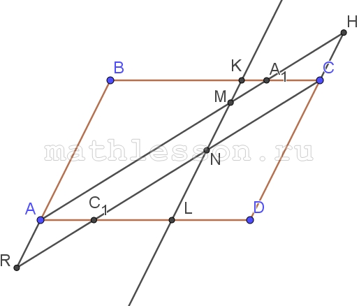 Биссектрисы $$AA_{1}$$ и $$CC_{1}$$; $$AA_{1}\cap CD=H$$; $$CC_{1}\cap AB=R$$