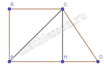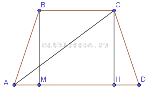 - Проведем перпендикуляры BM и CH к AD. Из треугольника CHD: $$HD=\sqrt{CD^{2}-CH^{2}}=\sqrt{5^{2}-4,8^{2}}=1,4$$