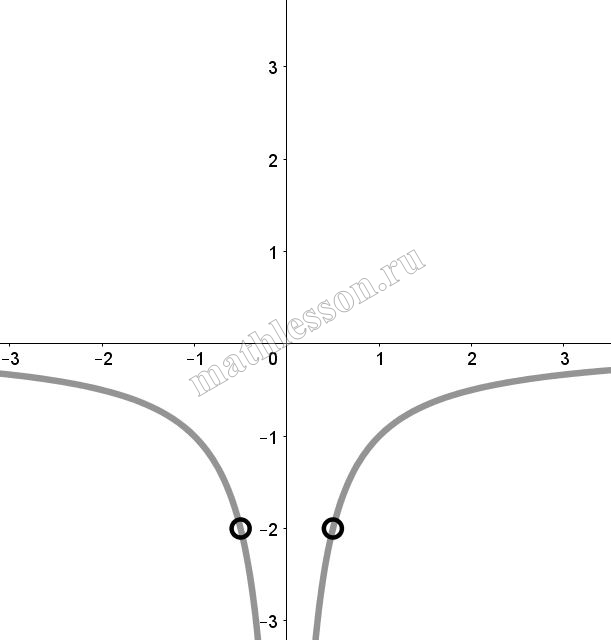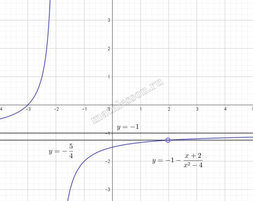 Учтем, что $$x\neq\pm 2$$. В случае $$x\neq -2$$ можно отдельно не рассматривать, так как это условие уже выполняется для графика функции $$y_{1}$$. Для $$x\neq 2$$: подставим значение $$x=2$$ в функции $$y_{1}$$: $$y_{1}(2)=-1-\frac{1}{2+2}=-\frac{5}{4}$$. То есть точку, с координатами $$(2;-\frac{5}{4})$$ необходимо отметить пустой на графике функции $$y_{1}$$ и тогда мы получим график искомой функции: