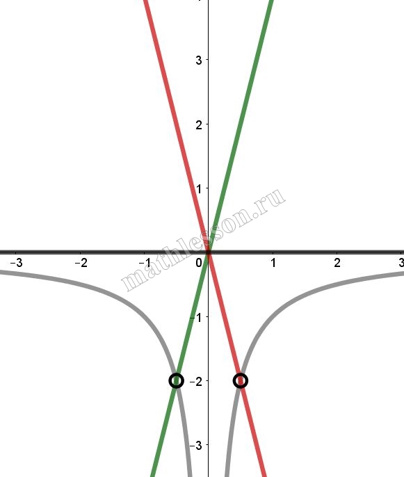Найдем k: $$y=kx$$ проходит через (-0,5 ; -2): $$-2=-0,5*k\Rightarrow k=4$$(зеленая) и через (0,5; -2): $$-2=0,5k\Rightarrow k=-4$$(красная). При k=0 (черная) тоже не имеет пересечений