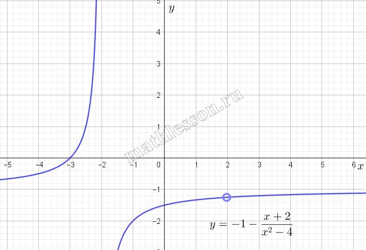 ОДЗ: $$x^{2}-4 \neq 0 \Leftrightarrow$$$$x\neq\pm 2$$. Преобразуем правую часть функции: $$-1-\frac{x-2}{x^{2}-4}=$$$$-1-\frac{x-2}{(x-2)(x+2)}=$$$$-1-\frac{1}{x+2}$$