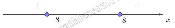 $$x^{2}=64\Leftrightarrow$$$$x=\pm 8$$. Отметим полученные значения на координатной прямой и расставим знаки значений, которые принимает выражение $$x^{2}-64$$ на полученных отрезках: