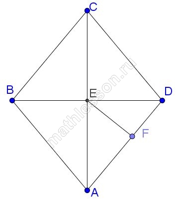Расстояние от точки пересечения диагоналей ромба до одной из его сторон равно $$14$$, а одна из диагоналей ромба равна $$56$$. Найдите углы ромба.